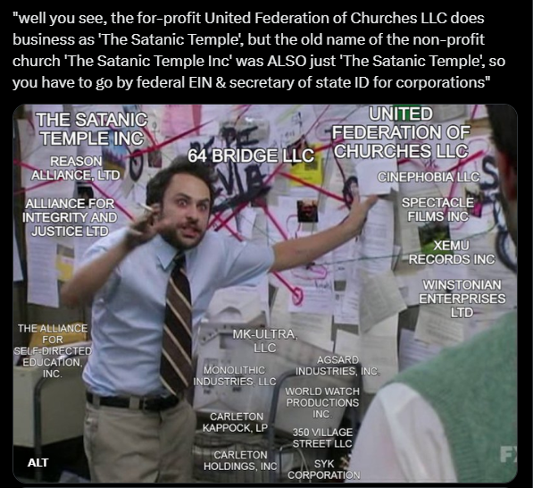 For that reason, when you are reading “The Satanic Temple” somewhere you never know whether they mean the for-profit entity, the tax-exempt church, or something else. Usually, TST wants it to mean whatever is most advantageous in that moment, narrowly.