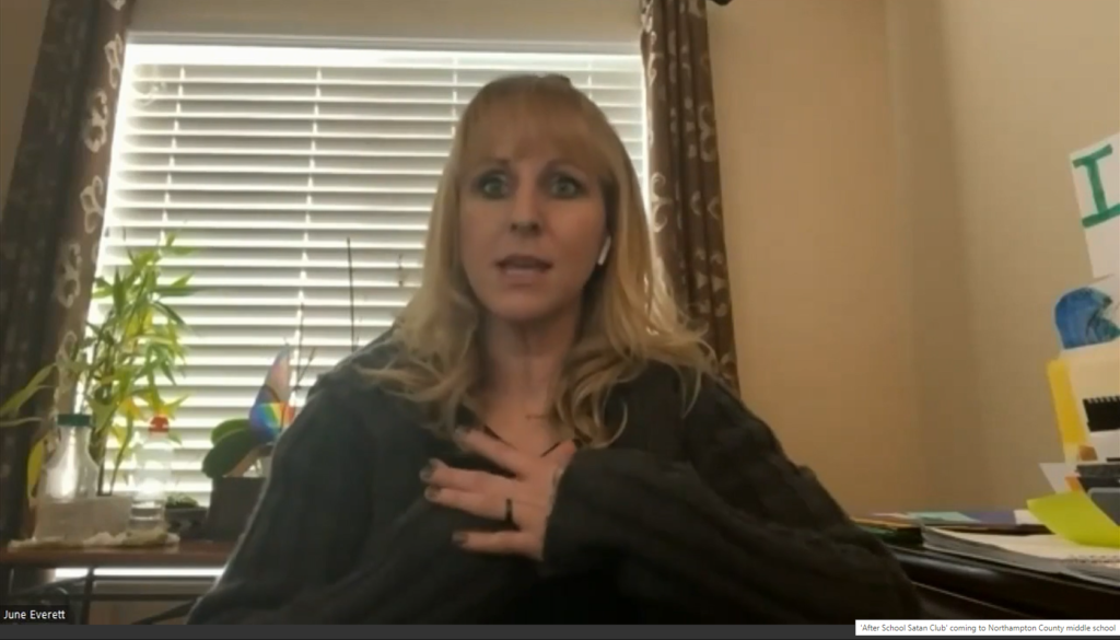 June Everett, an ordained minister of The Satanic Temple and the campaign manager of the After School Satan Club, said the meeting “was anti-climatic” and they were “just hanging out and having a good time playing games and enjoying snacks.”