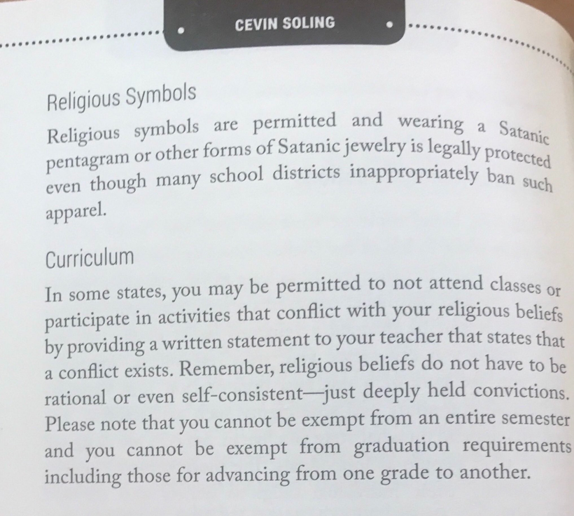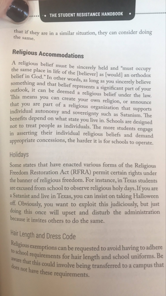A religious belief must be sincerely held and “must occupy the same place in life of the [believer] as [would] orthodox belief in God.” In other words, so long as you sincerely believe something and that belief represents a significant part of your outlook, it can be deemed a religious belief under the law. This means you can create your own religion, or announce that you are part of a religious organization that supports individual autonomy and sovereignty such as Satanism. The benefits depend on what state you live in. Schools are designed not to treat people as individuals. The more students engage in asserting their individual religious beliefs and demand appropriate concessions, the harder it is for schools to operate.