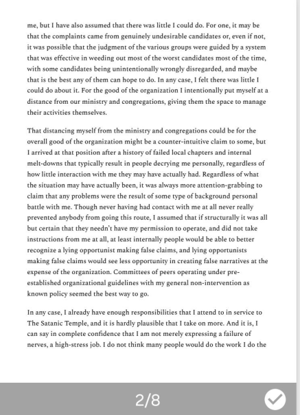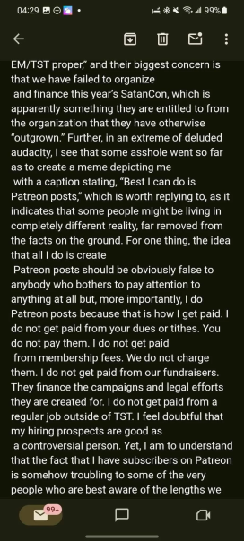 There is also no reason to believe that in quantifiable metrics The Satanic Temple is coming out any better for all of this, but it’s probably true that in the sense of “purging people with institutional memory and independent bases of support” Misicko is pleased. As you read through the assessment Misicko makes about those who have left, there’s no reason for you to give him the benefit of the doubt that he doesn’t believe it.