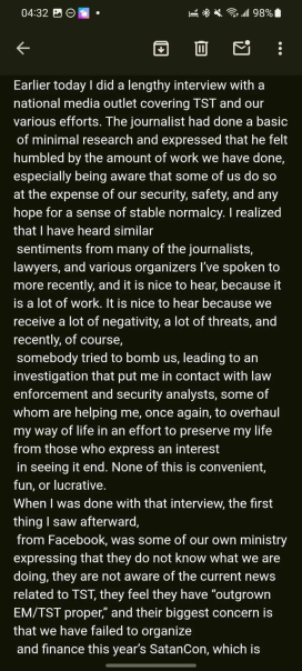 When I was done with that interview, the first thing I saw afterward, from Facebook, was some of our own ministry expressing that they do not know what we are doing, they are not aware of the current news related to TST, they feel they have “outgrown EM/TST proper,” and their biggest concern is that we have failed to organize and finance this year’s SatanCon, which is apparently something they are entitled to from the organization that they have otherwise outgrown.”