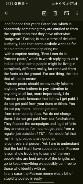 Further, in an extreme of deluded audacity, I see that some asshole went so far as to create a meme depicting me with a caption stating, “Best I can do is Patreon posts,” which is worth replying to, as it indicates that some people might be living in completely different reality, far removed from the facts on the ground. For one thing, the idea that all I do is create Patreon posts should be obviously false to anybody who bothers to pay attention to anything at all but, more importantly, I do Patreon posts because that is how I get paid. I do not get paid from your dues or tithes. You do not pay them. I do not get paid from membership fees. We do not charge them. I do not get paid from our fundraisers. They finance the campaigns and legal efforts they are created for. I do not get paid from a regular job outside of TST. I feel doubtful that my hiring prospects are good as a controversial person. Yet, I am to understand that the fact that I have subscribers on Patreon is somehow troubling to some of the very people who are best aware of the lengths we go to keep everything we possibly can free to those who identify with us.