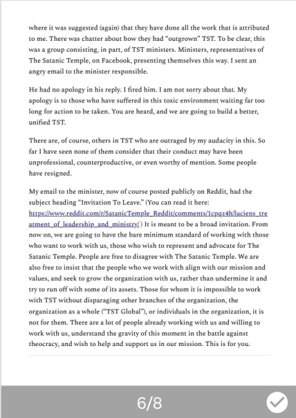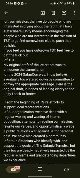 My email to the minister, now of course posted publicly on Reddit, had the subject heading “Invitation To Leave.” (You can read it here: https://www.reddit.com/r/SatanicTemple_Reddit/comments/1cpqz4h/luciens_treatment_of_leadership_and_ministry/ ) It is meant to be a broad invitation. From now on, we are going to have the bare minimum standard of working with those who want to work with us, those who wish to represent and advocate for The Satanic Temple. People are free to disagree with The Satanic Temple. We are also free to insist that the people who we work with align with our mission and values, and seek to grow the organization with us, rather than undermine it and try to run off with some of its assets. Those for whom it is impossible to work with TST without disparaging other branches of the organization, the organization as a whole (“TST Global”), or individuals in the organization, it is not for them. There are a lot of people already working with us and willing to work with us, understand the gravity of this moment in the battle against theocracy, and wish to help and support us in our mission. This is for you.”