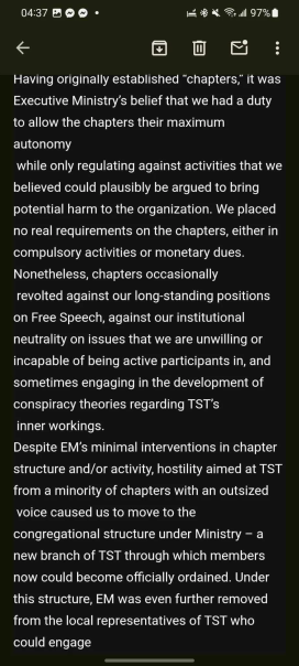 > Despite EM’s minimal interventions in chapter structure and/or activity, hostility aimed at TST from a minority of chapters with an outsized voice caused us to move to the congregational structure under Ministry – a new branch of TST through which members now could become officially ordained. Under this structure, EM was even further removed from the local representatives of TST who could engage with the campaigns and order their congregations as they saw fit. It did not help.