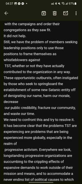 > Still, we have the problem of members seeking leadership positions only to use those positions to frame themselves as whistleblowers against TST, whether or not they have actually contributed to the organization in any way. These opportunistic outbursts, often instigated by those who seek to springboard the establishment of some new Satanic entity off of denigrating our name, harm our morale, decrease our public credibility, fracture our community, and waste our time.