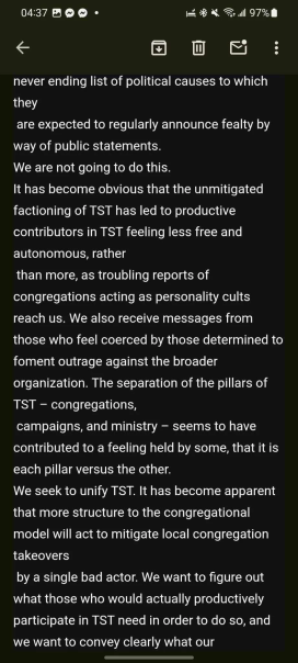 > It has become obvious that the unmitigated factioning of TST has led to productive contributors in TST feeling less free and autonomous, rather than more, as troubling reports of congregations acting as personality cults reach us. We also receive messages from those who feel coerced by those determined to foment outrage against the broader organization. The separation of the pillars of TST – congregations,
