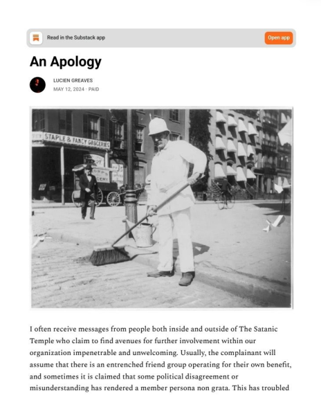 Lucien Greaves posts “An Apology” on Substack