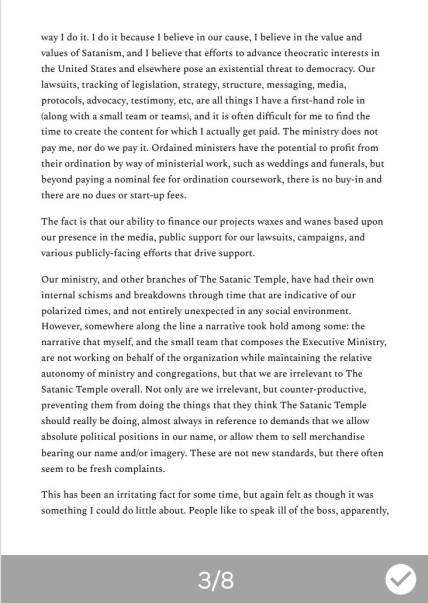 That distancing myself from the ministry and congregations could be for the overall good of the organization might be a counter-intuitive claim to some, but I arrived at that position after a history of failed local chapters and internal melt-downs that typically result in people decrying me personally, regardless of how little interaction with me they may have actually had. Regardless of what the situation may have actually been, it was always more attention-grabbing to claim that any problems were the result of some type of background personal battle with me. Though never having had contact with me at all never really prevented anybody from going this route, I assumed that if structurally it was all but certain that they needn’t have my permission to operate, and did not take instructions from me at all, at least internally people would be able to better recognize a lying opportunist making false claims, and lying opportunists making false claims would see less opportunity in creating false narratives at the expense of the organization. Committees of peers operating under pre-established organizational guidelines with my general non-intervention as known policy seemed the best way to go. In any case, I already have enough responsibilities that I attend to in service to The Satanic Temple, and it is hardly plausible that I take on more. And it is, I can say in complete confidence that I am not merely expressing a failure of nerves, a high-stress job. I do not think many people would do the work I do the way I do it. I do it because I believe in our cause, I believe in the value and values of Satanism, and I believe that efforts to advance theocratic interests in the United States and elsewhere pose an existential threat to democracy. Our lawsuits, tracking of legislation, strategy, structure, messaging, media, protocols, advocacy, testimony, etc, are all things I have a first-hand role in (along with a small team or teams), and it is often difficult for me to find the time to create the content for which I actually get paid. The ministry does not pay me, nor do we pay it. Ordained ministers have the potential to profit from their ordination by way of ministerial work, such as weddings and funerals, but beyond paying a nominal fee for ordination coursework, there is no buy-in and there are no dues or start-up fees.
