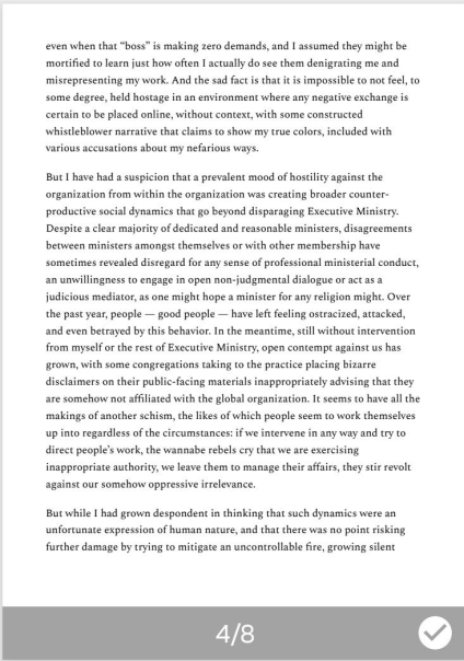 This has been an irritating fact for some time, but again felt as though it was something I could do little about. People like to speak ill of the boss, apparently, even when that “boss” is making zero demands, and I assumed they might be mortified to learn just how often I actually do see them denigrating me and misrepresenting my work. And the sad fact is that it is impossible to not feel, to some degree, held hostage in an environment where any negative exchange is certain to be placed online, without context, with some constructed whistleblower narrative that claims to show my true colors, included with various accusations about my nefarious ways. But I have had a suspicion that a prevalent mood of hostility against the organization from within the organization was creating broader counter-productive social dynamics that go beyond disparaging Executive Ministry. Despite a clear majority of dedicated and reasonable ministers, disagreements between ministers amongst themselves or with other membership have sometimes revealed disregard for any sense of professional ministerial conduct, an unwillingness to engage in open non-judgmental dialogue or act as a judicious mediator, as one might hope a minister for any religion might. Over the past year, people — good people — have left feeling ostracized, attacked, and even betrayed by this behavior. In the meantime, still without intervention from myself or the rest of Executive Ministry, open contempt against us has grown, with some congregations taking to the practice placing bizarre disclaimers on their public-facing materials inappropriately advising that they are somehow not affiliated with the global organization. It seems to have all the makings of another schism, the likes of which people seem to work themselves up into regardless of the circumstances: if we intervene in any way and try to direct people’s work, the wannabe rebels cry that we are exercising inappropriate authority, we leave them to manage their affairs, they stir revolt against our somehow oppressive irrelevance.