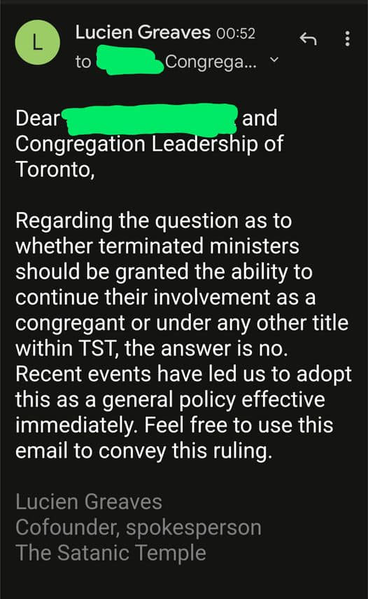 I was a member of the Satanic Ministry from April 5, 2023 until I was defrocked on June 5, 2024. I was a member of Recognition and Onboarding Committee from the beginning of July 2023 until I was defrocked, and was the sole representative for the Canada East region starting in August of that year after Minister Neacail, for whom I took over, stepped down to focus on other TST matters. I was part of local leadership in Toronto from late 2019 until I was suspended on June 9 of this year. I was also informed today that, per an edict from Lucien Greaves, all ministers who have been defrocked have also lost their congregant status, and are prevented from holding any titles related to participation in TST, which is, effectively, excommunication. (edit: It seems, after rereading edict, that I was the inspiration for it)