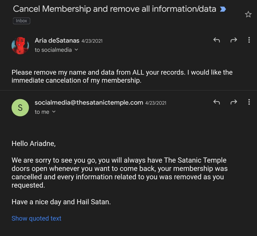 Note, though, that to actually revoke your membership you ought to use this link, and you may even need to send an email to socialmedia@thesatanictemple.com specifying “Please remove my name and data from ALL your records”