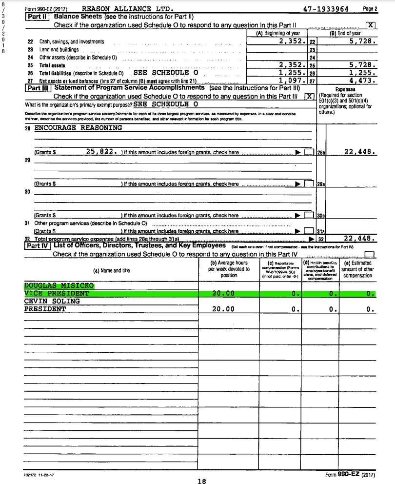 There’s absolutely no reason to believe these people — even under oath! — given how much they have been caught lying. Doug Misicko claimed he paid himself nothing from Reason Alliance in 2017, as he claimed every year.