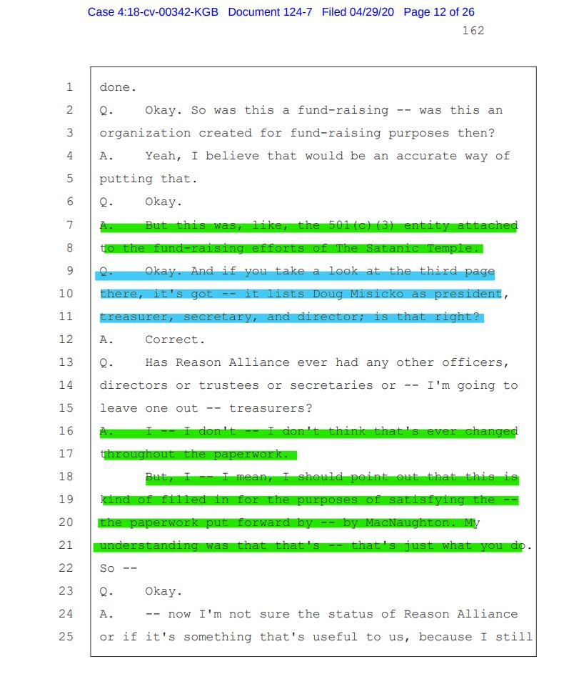 - You have read Doug Misicko (“Lucien Greaves”) admit that he was paying himself with The Satanic Temple’s funds but claim he never really kept track of how much and never providing evidence beyond his word. If you think Misicko’s word during sworn testimony should be good enough, note how “not more than $2,000 per month” was immediately hedged after a follow-up question, for example, but also other instances he was caught lying.